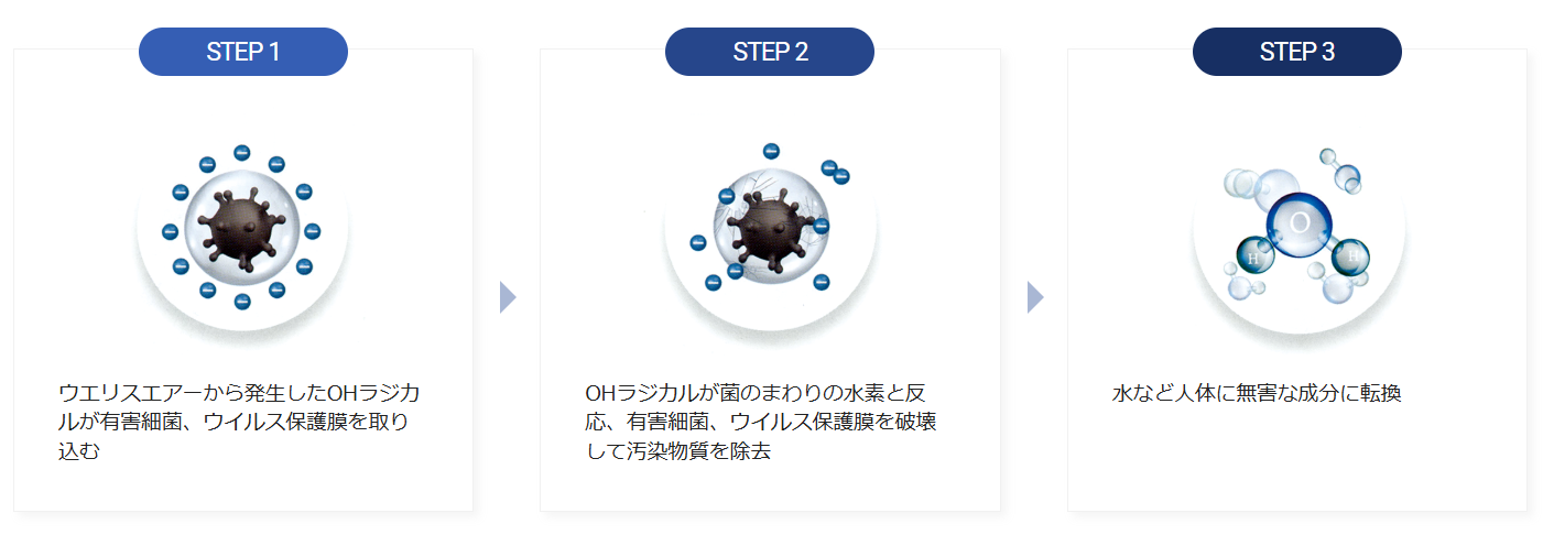 OHラジカルは、太陽の光、大気のオゾン、空気中の水分などから自然発生する天然物質で強い除菌力があり、汚染物質を積極的に探して除去します。