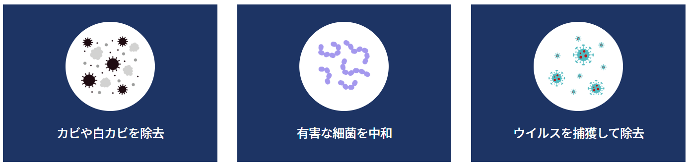 空気・壁・布などの各種汚染物質(ウイルス、細菌、花粉、カビ、臭い、バクテリア、たばこの煙など)の除去・消臭に隅々までアプローチします。