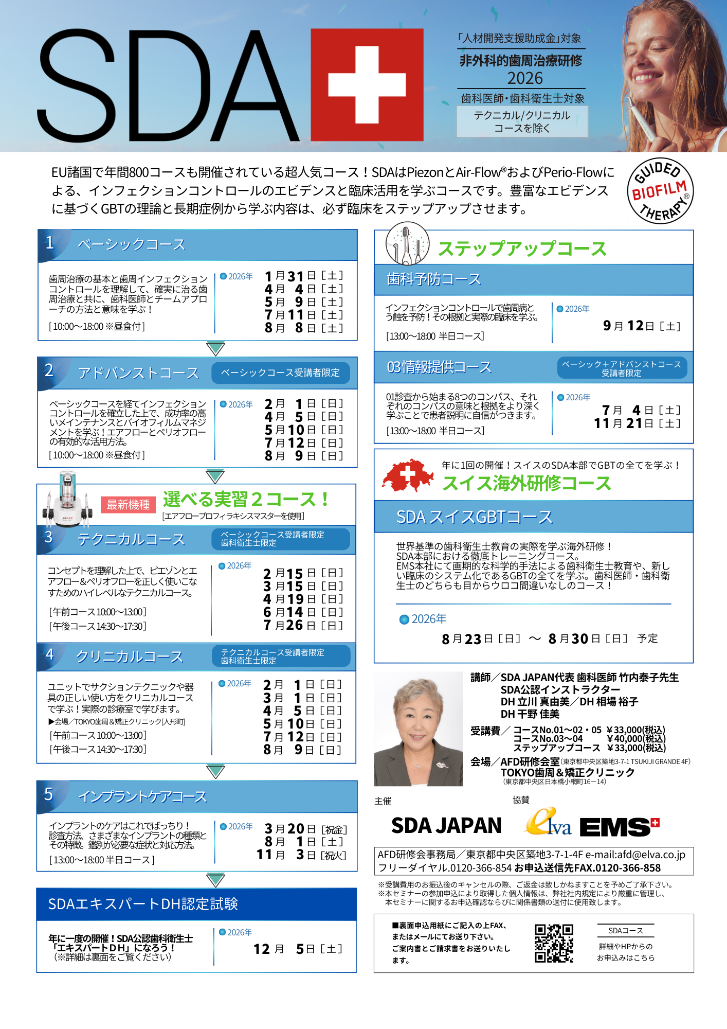 SDA本部における徹底トレーニングとジュネーブ大学で受講するインプラント周囲炎の講義、ハイレベルなスイスの歯科衛生士学校のユニークな教育を実体験。歯科医師・歯科衛生士のどちらも目からウロコ間違いなしのコースです。